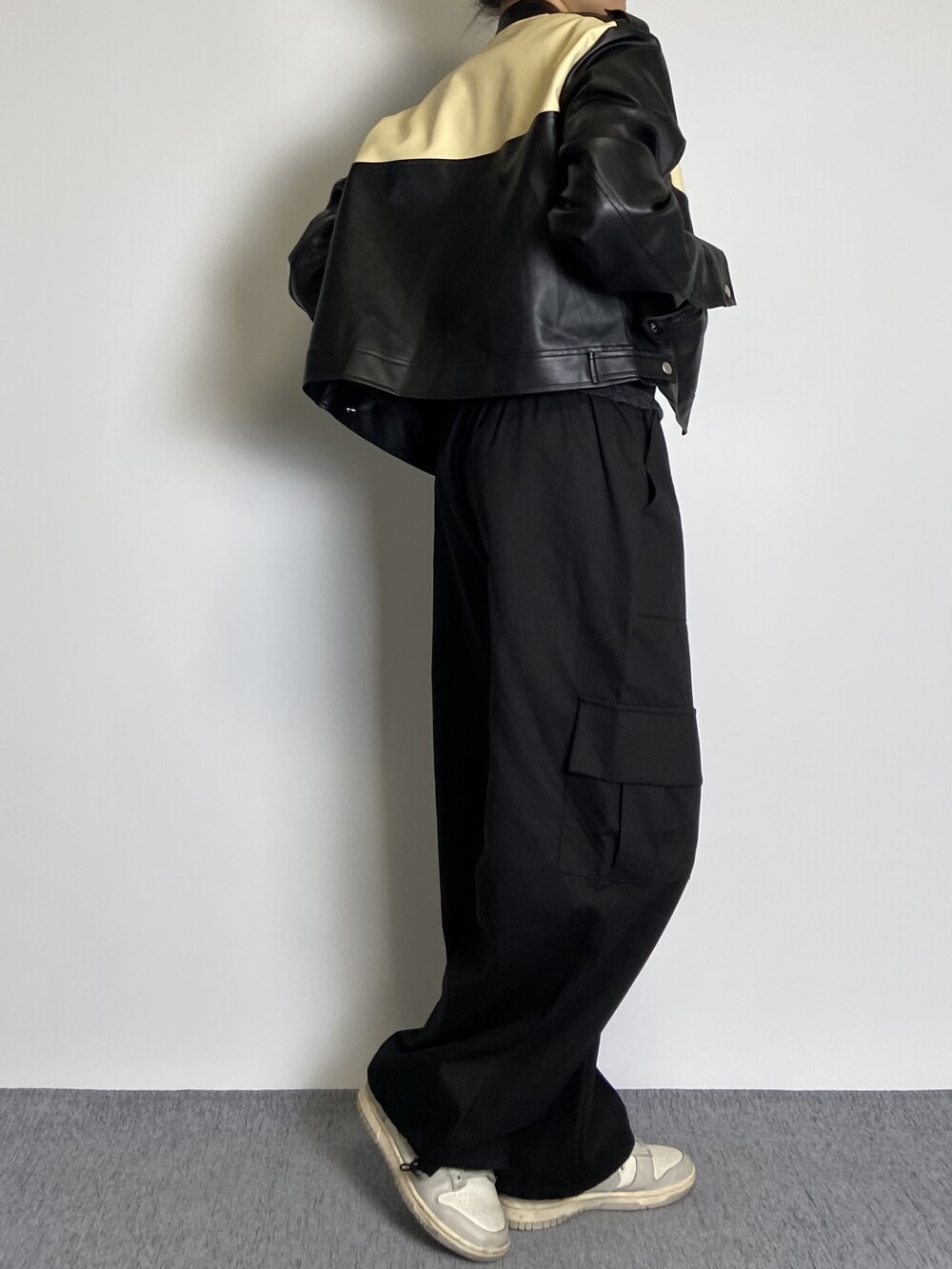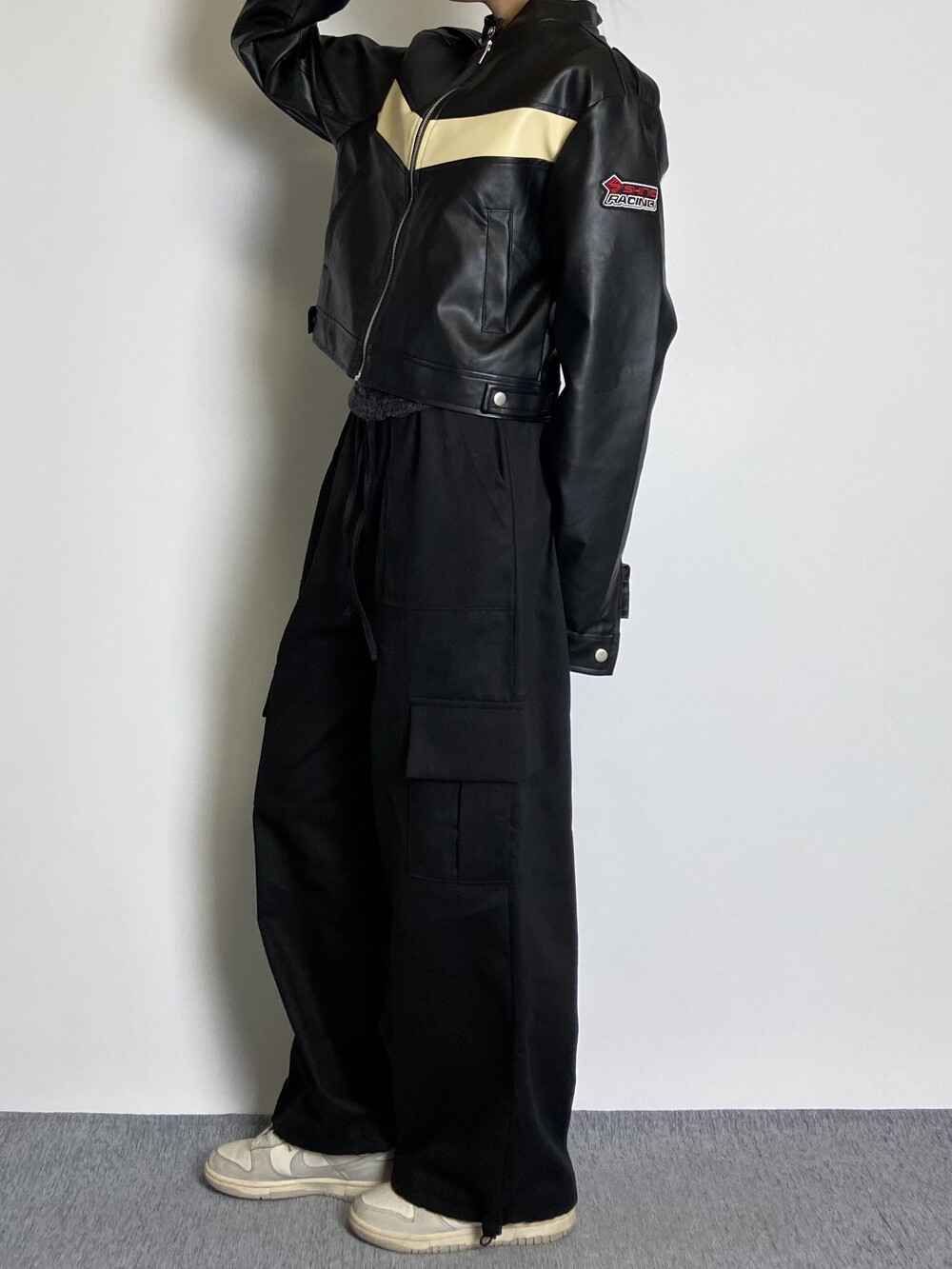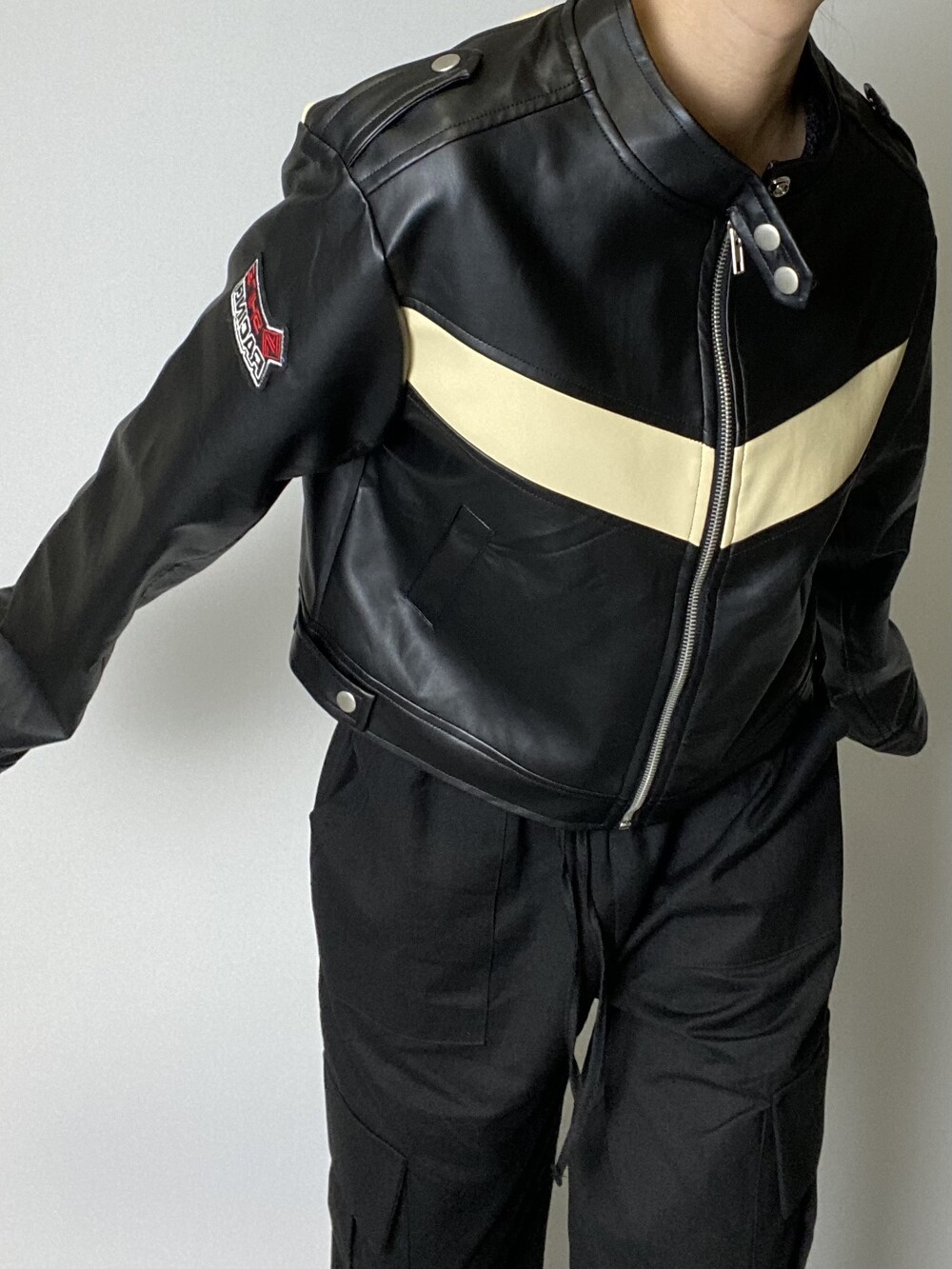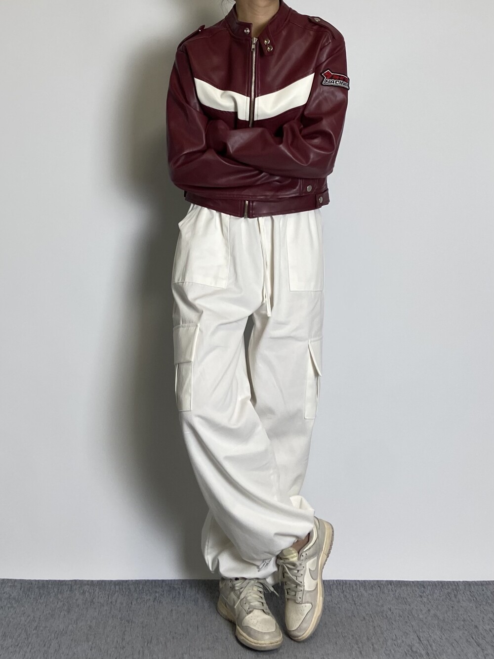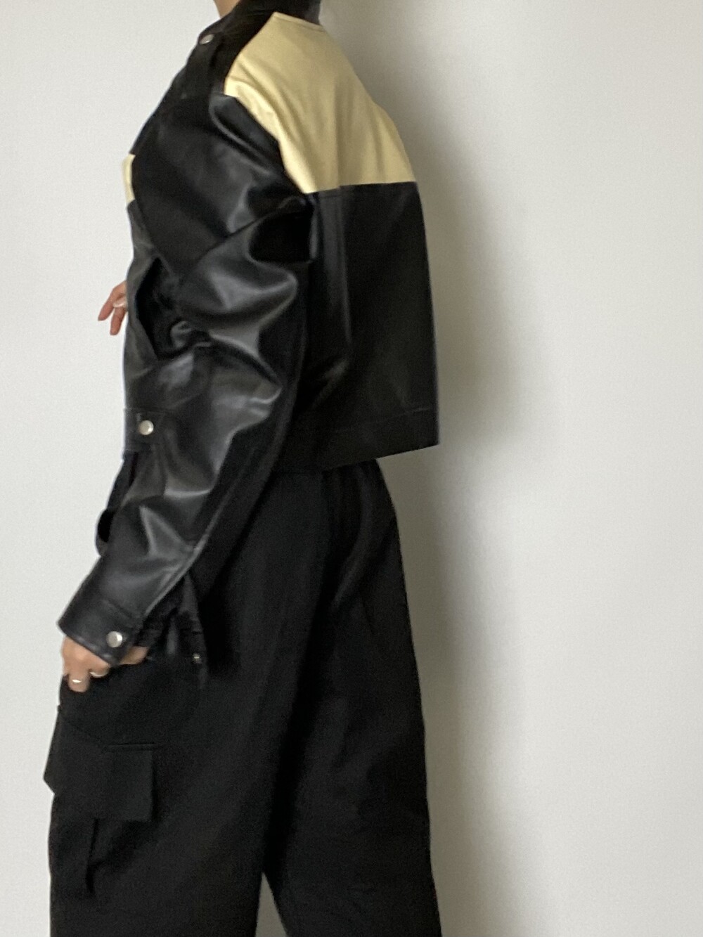 사이드포켓이 있으며 와펜과 스냅 버튼, 배색 디테일로