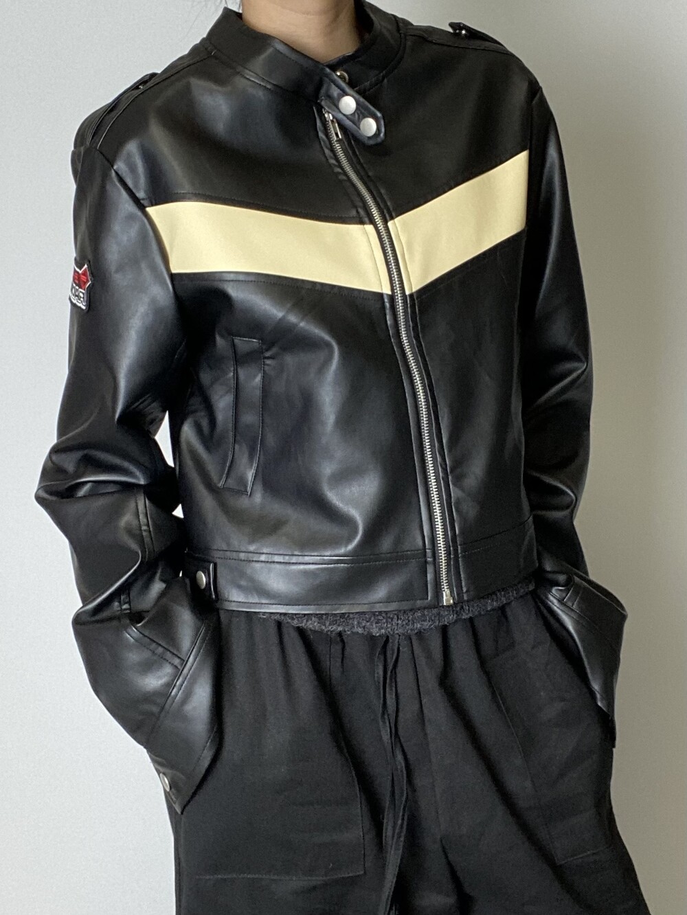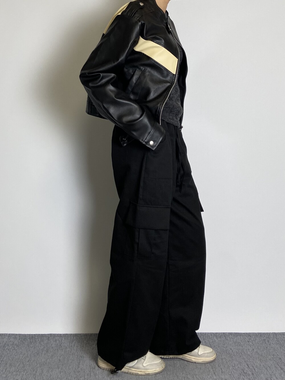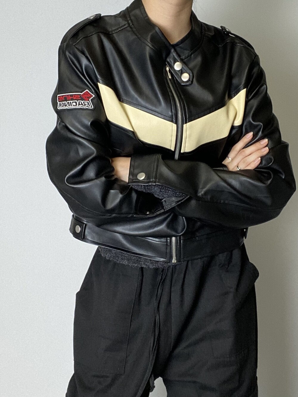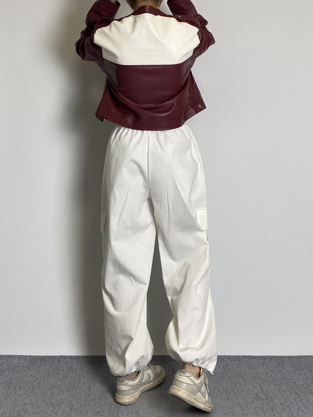 사이드포켓이 있으며 와펜과 스냅 버튼, 배색 디테일로