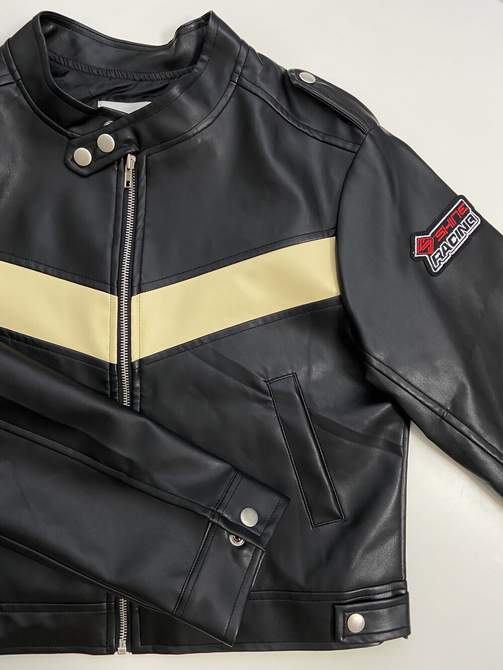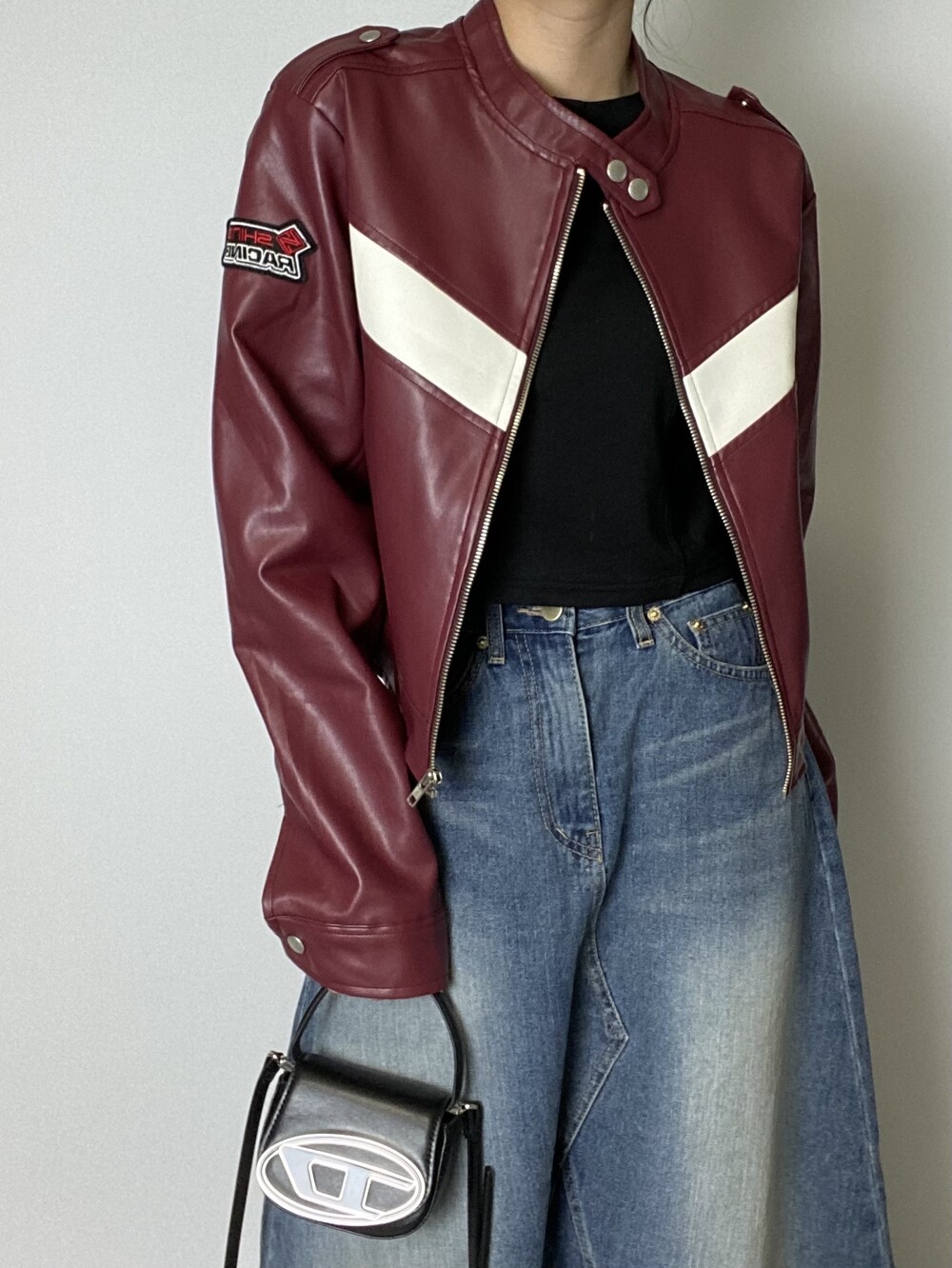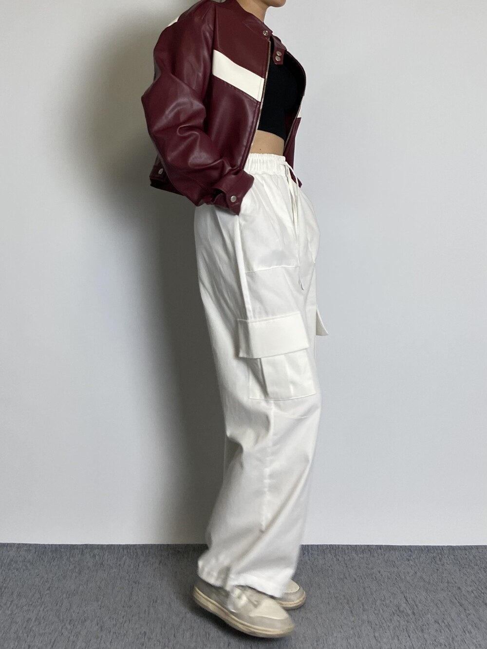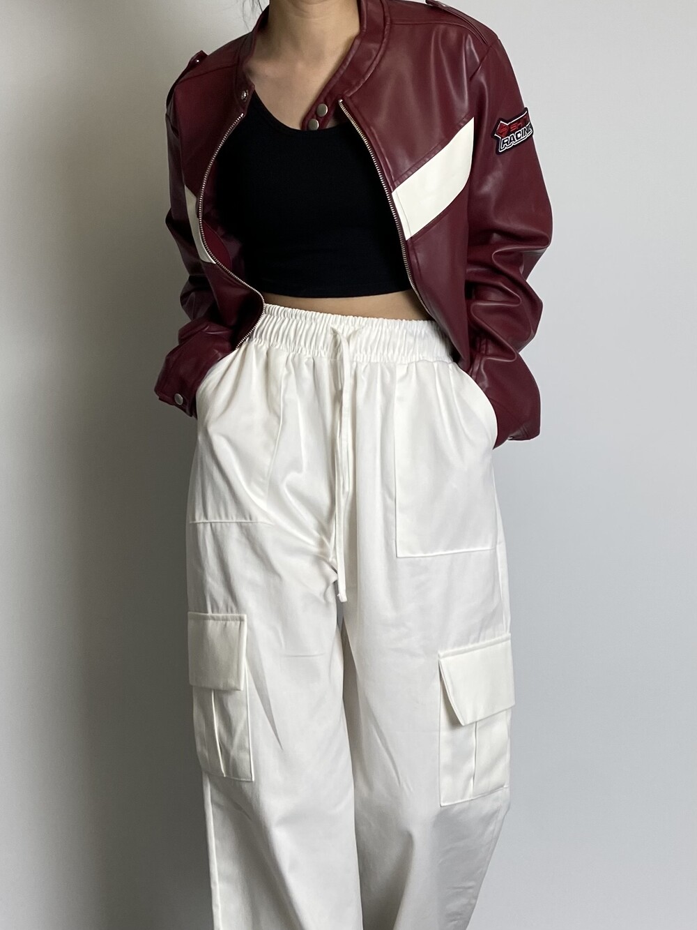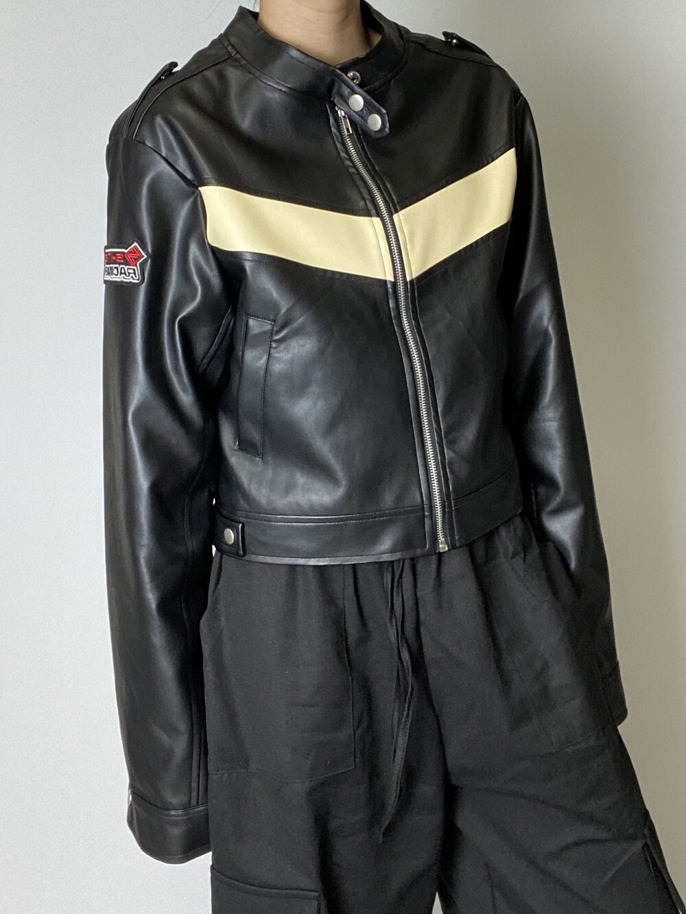 사이드포켓이 있으며 와펜과 스냅 버튼, 배색 디테일로