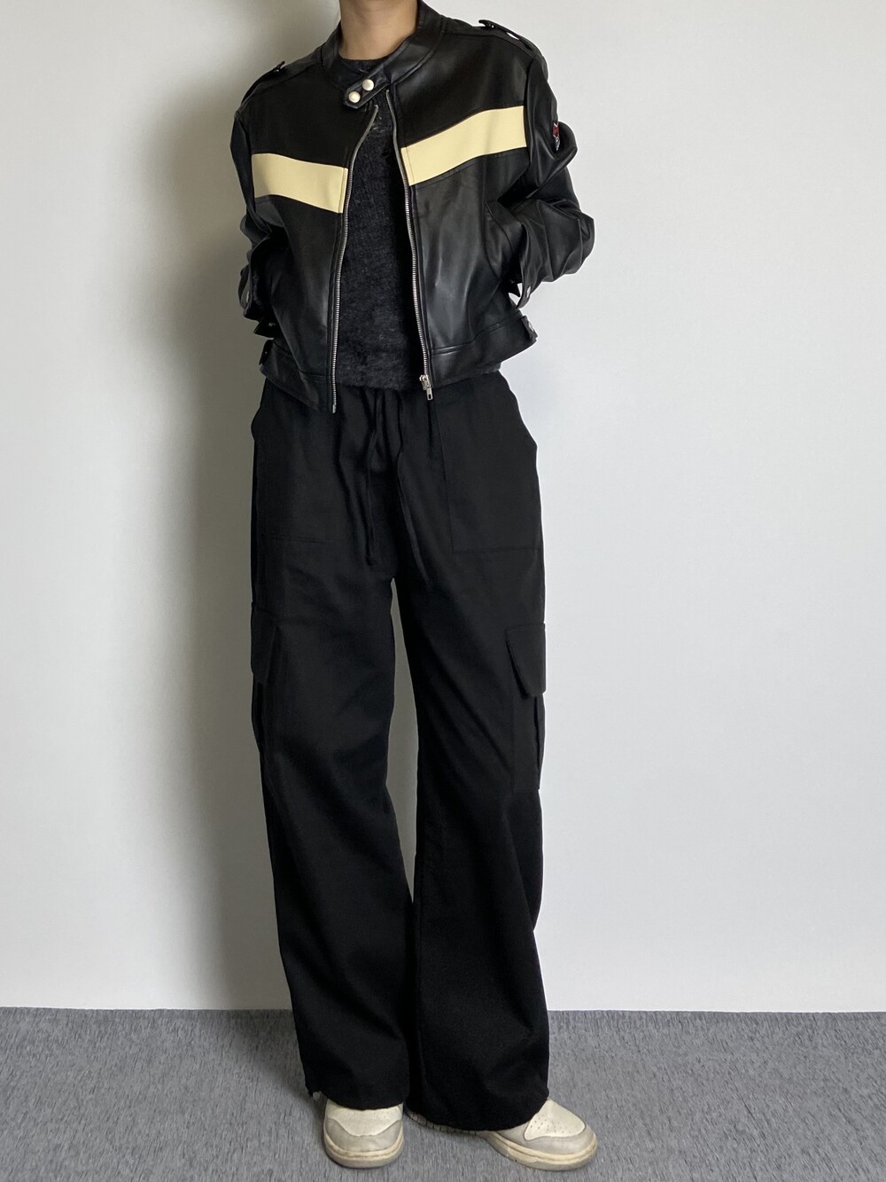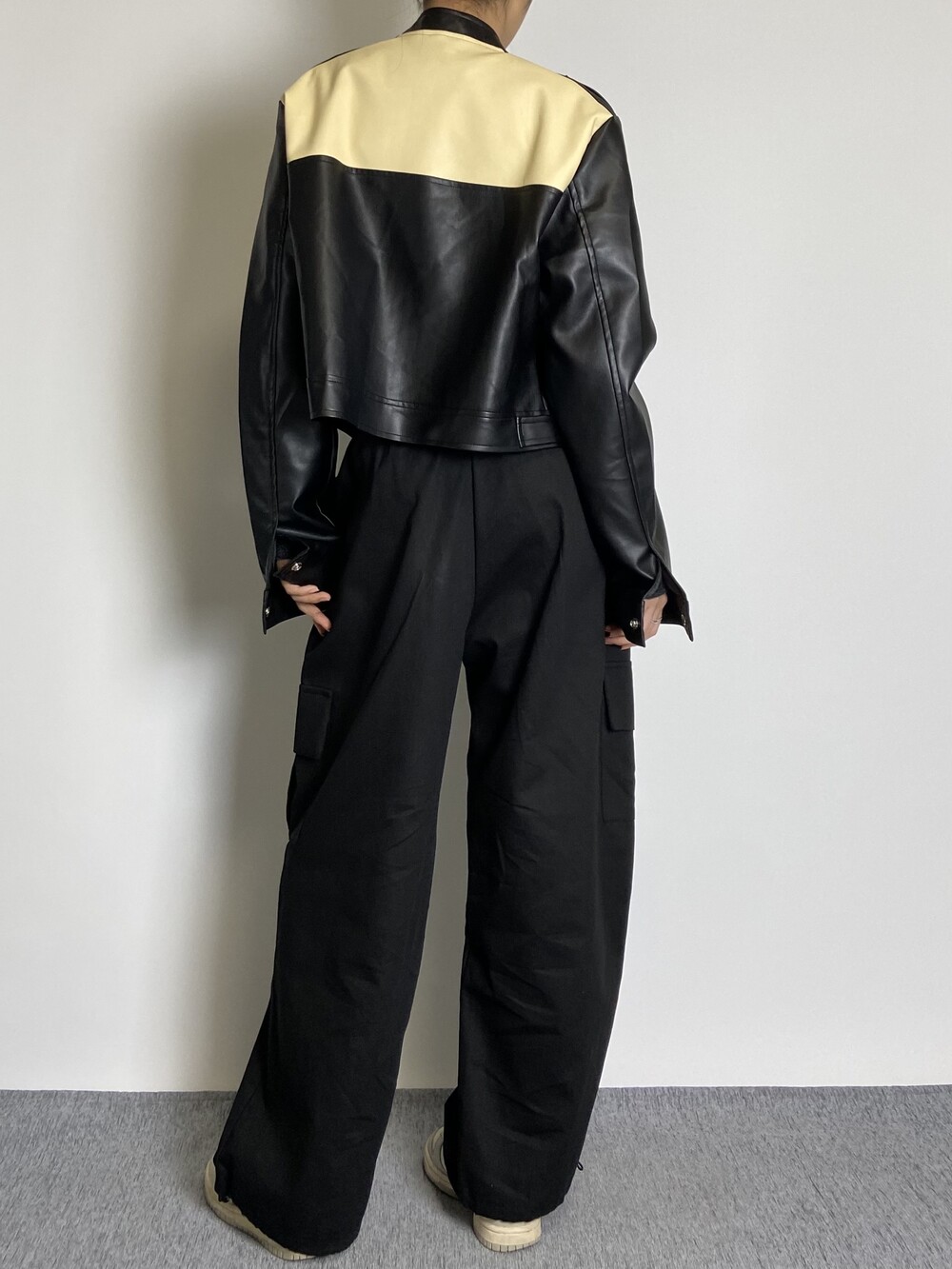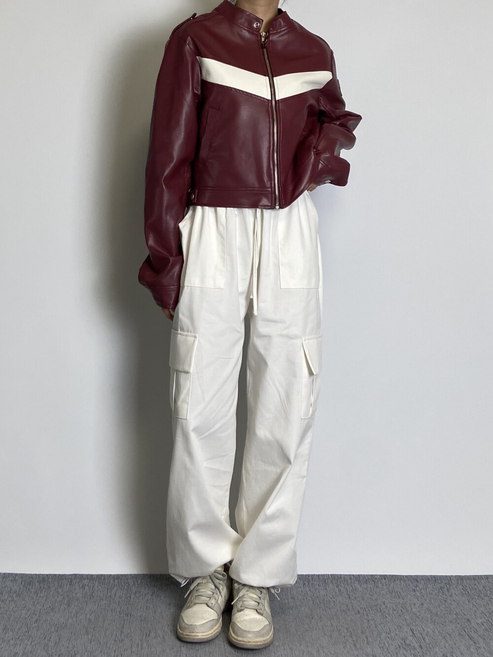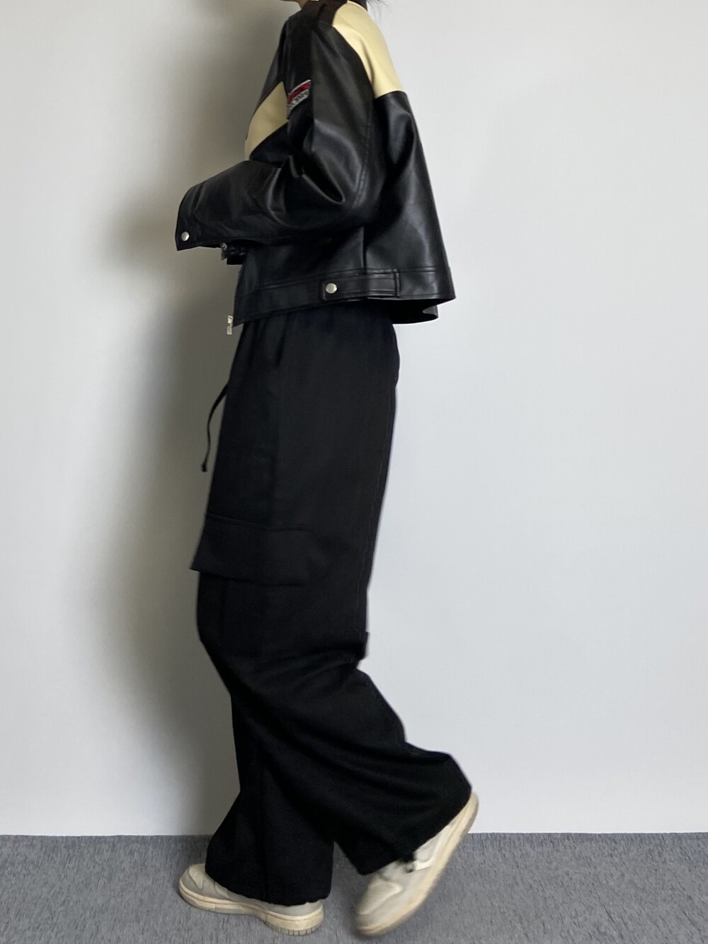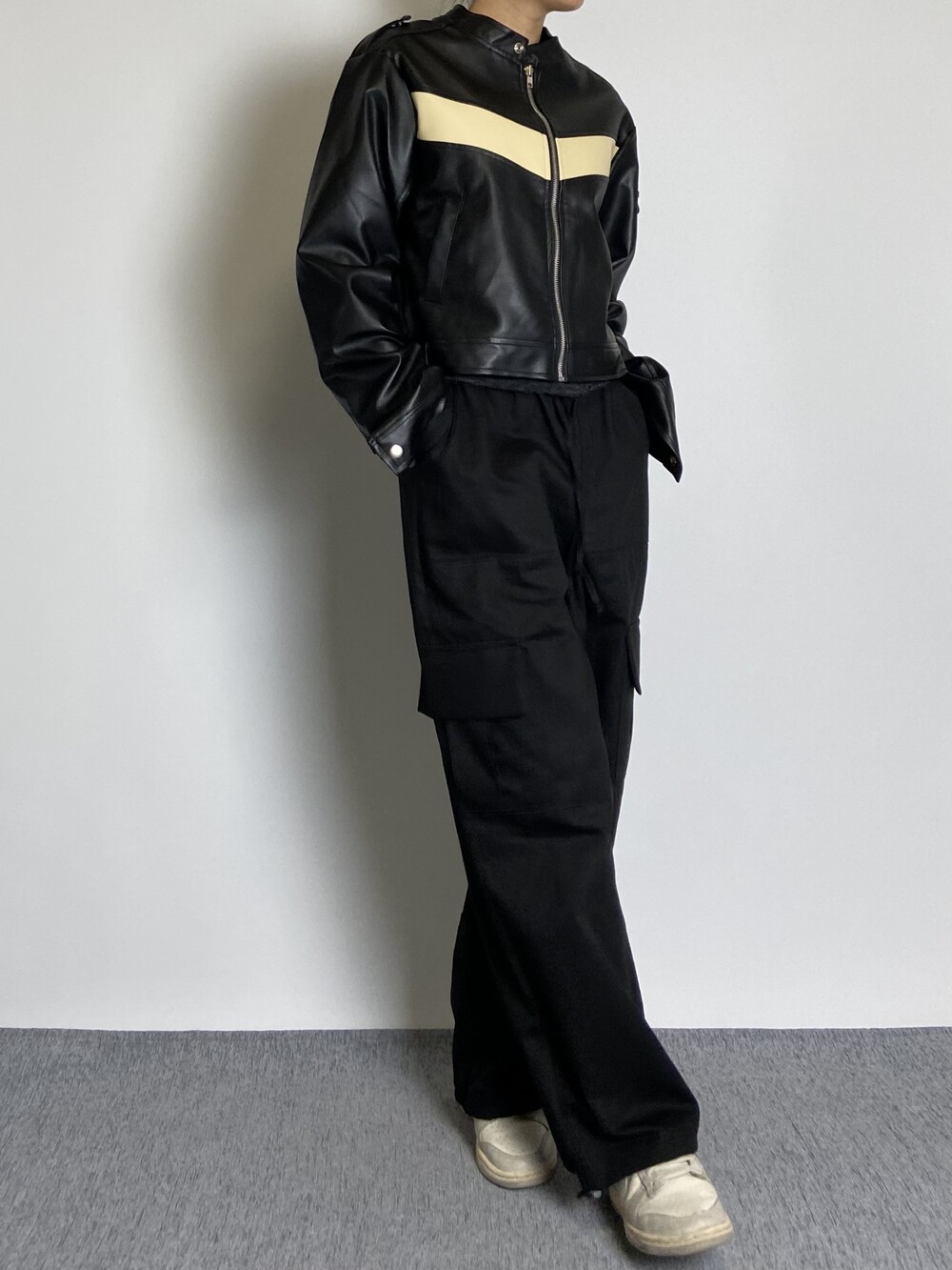 사이드포켓이 있으며 와펜과 스냅 버튼, 배색 디테일로