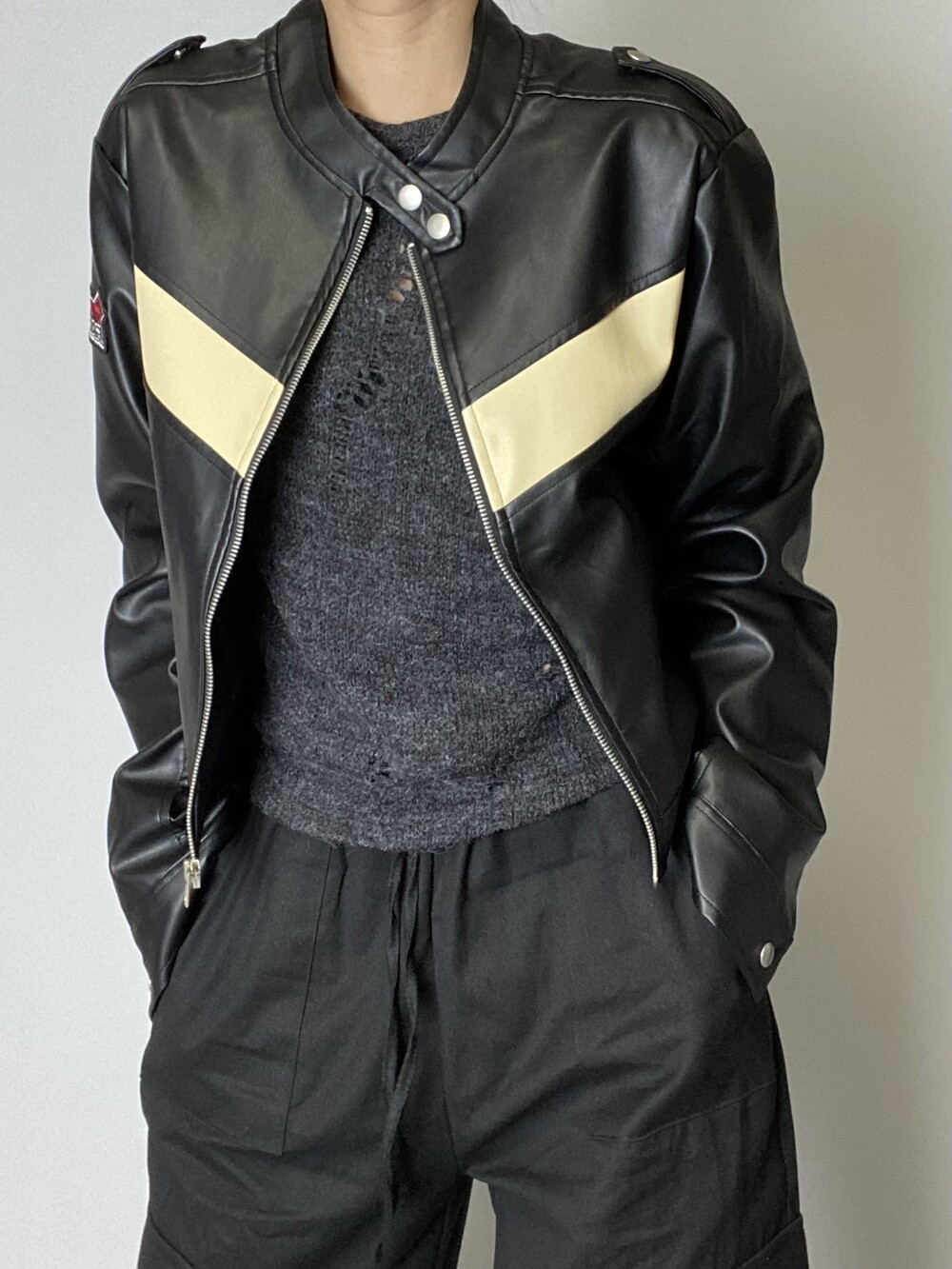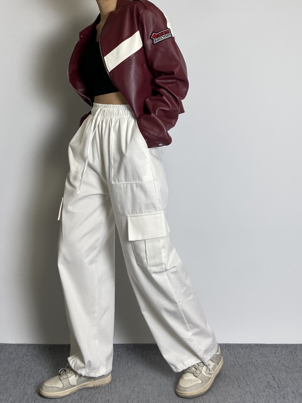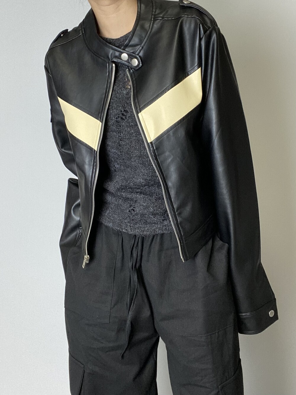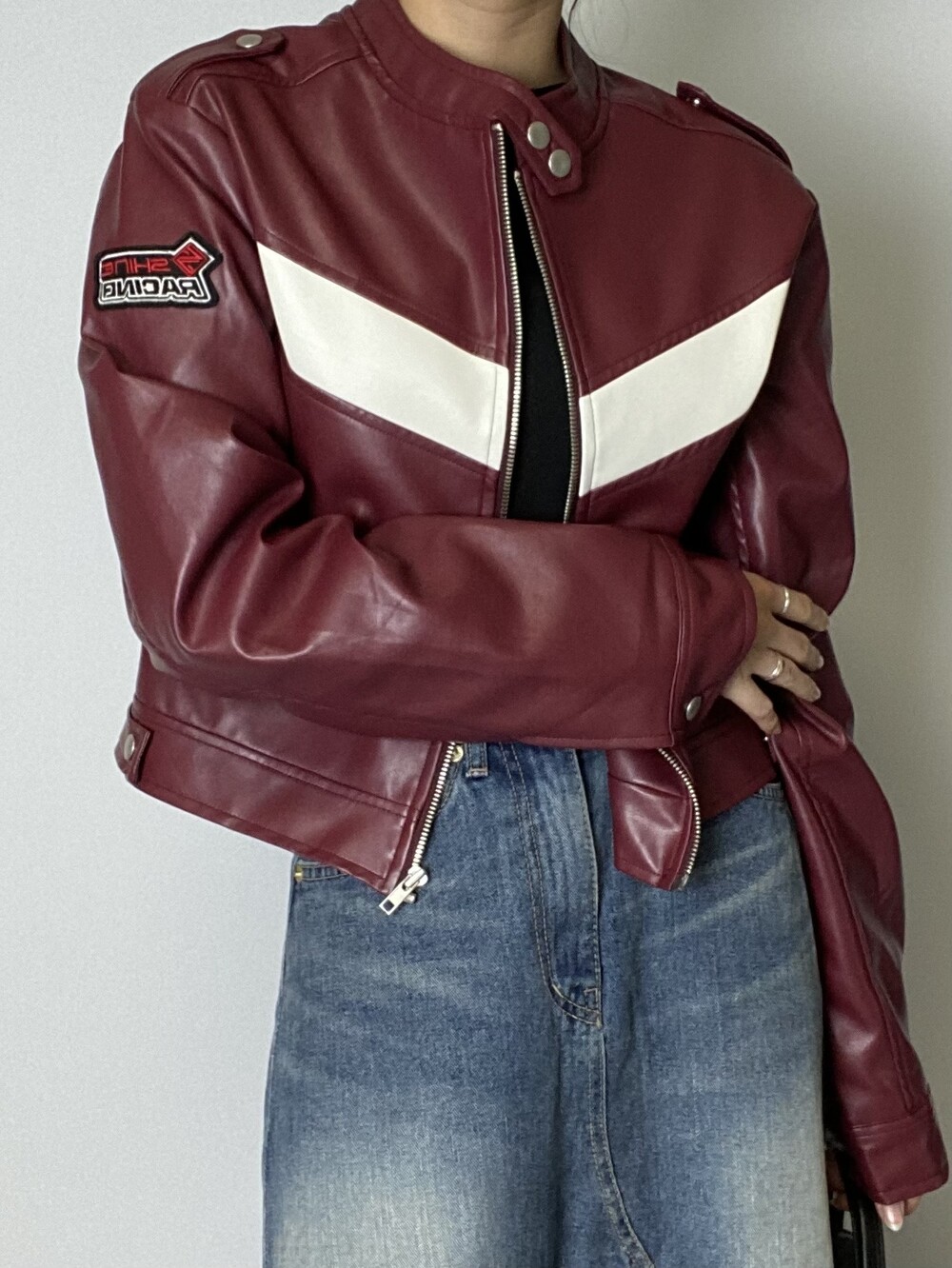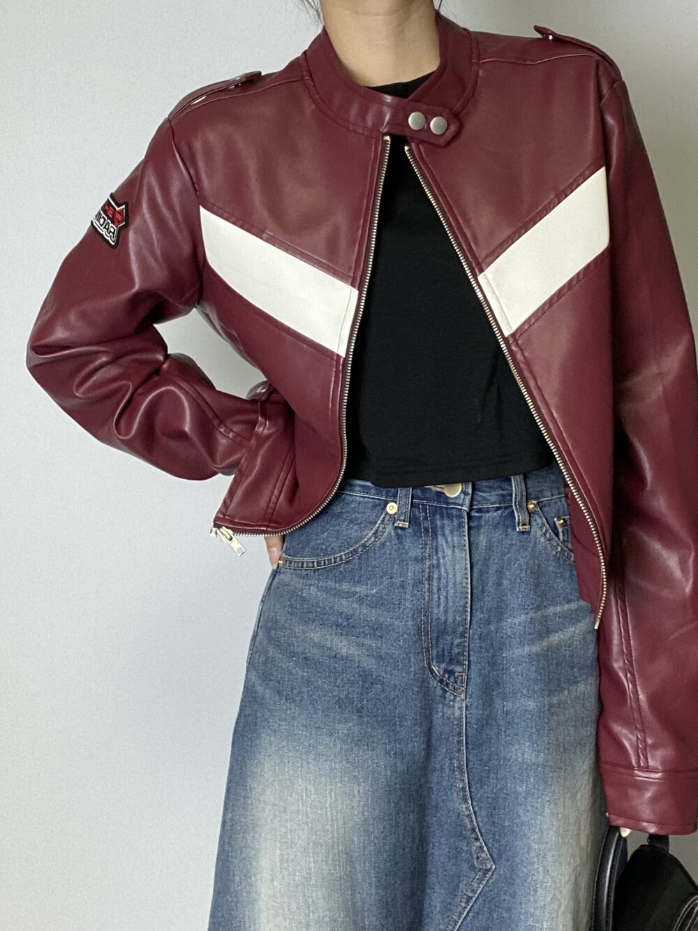 사이드포켓이 있으며 와펜과 스냅 버튼, 배색 디테일로