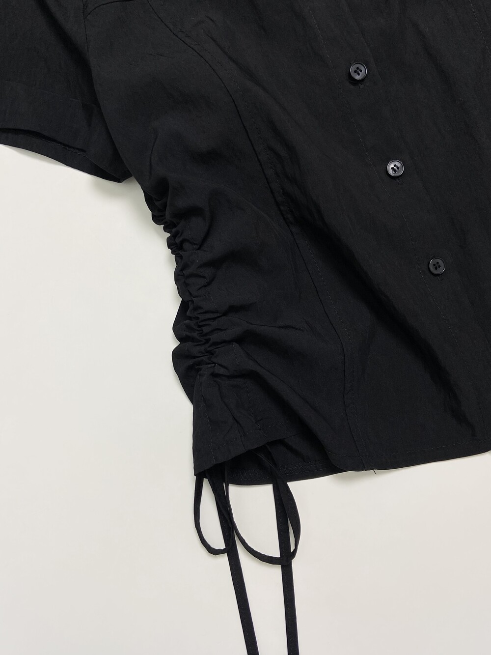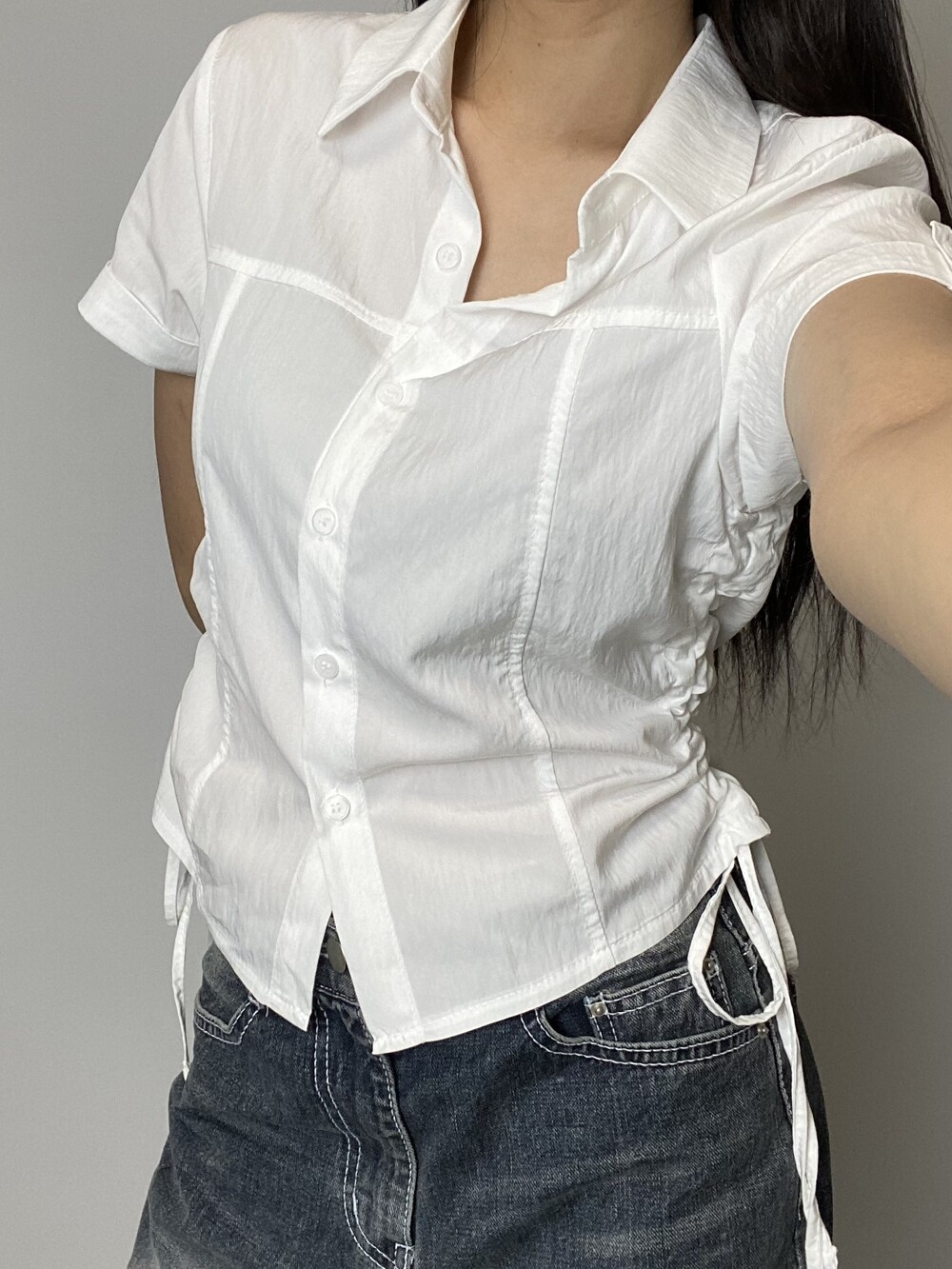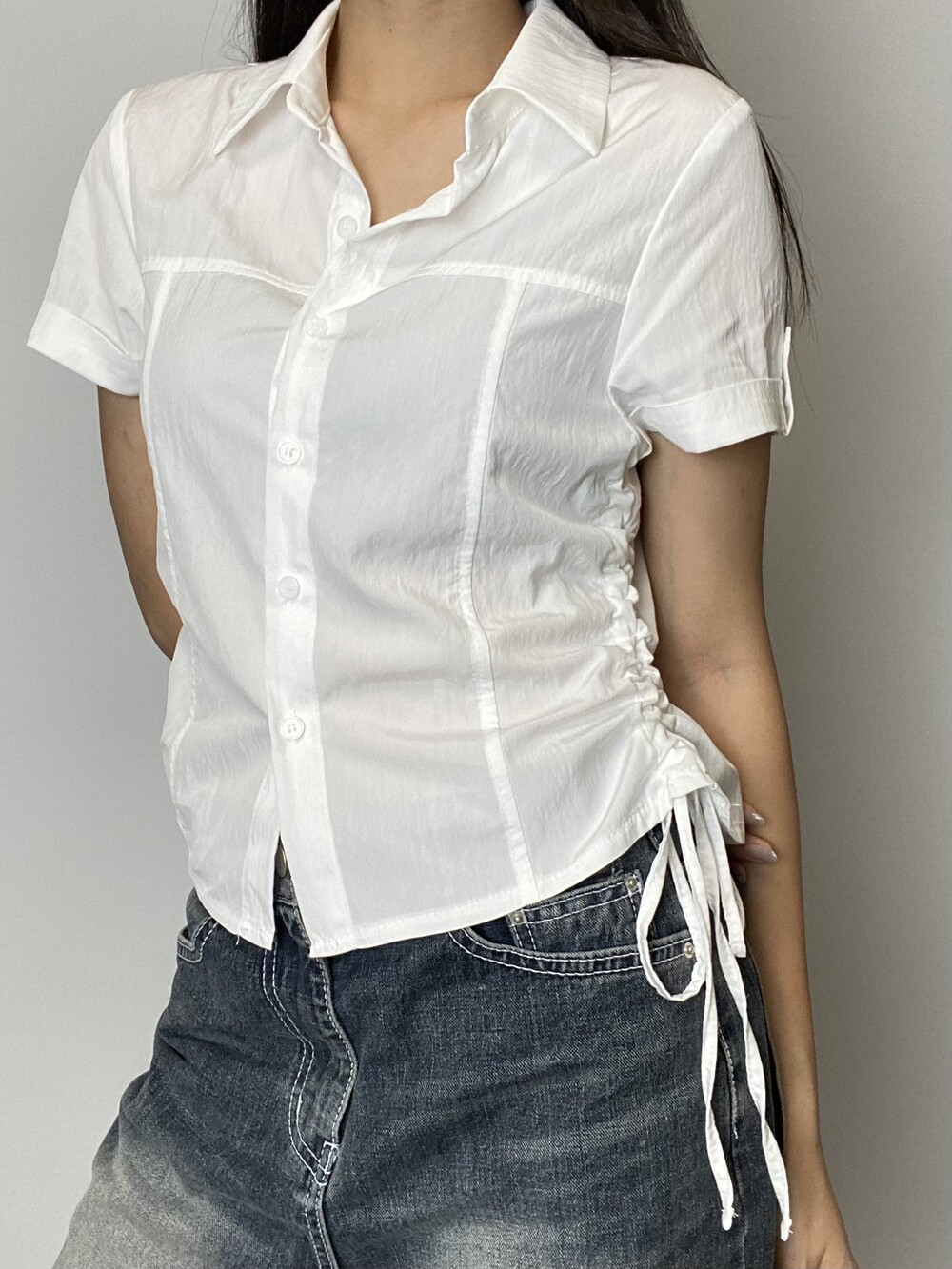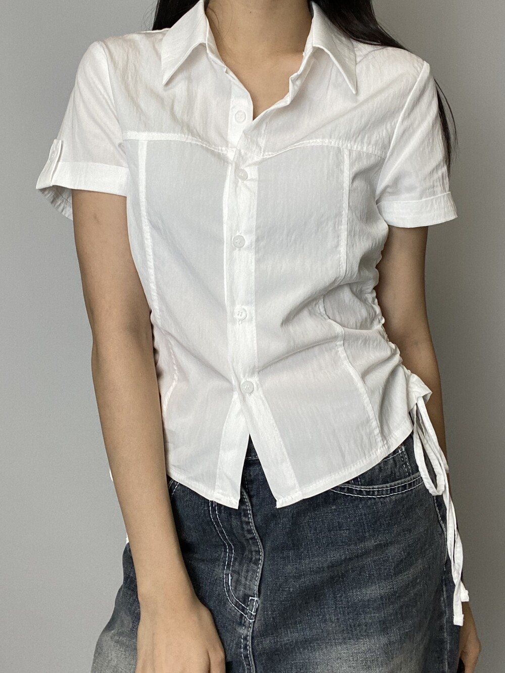 소매 롤업과 허리라인 셔링 디테일로 허리를 잘록하게 연출해 주며
